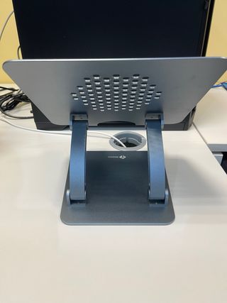 Soporte metálico para portátil, ajustable y con ventilación. - Base estable con almohadillas antideslizantes. - Diseño abierto para mejorar la disipación del calor. - Acabado en color gris azulado. - Ajustable en altura e inclinación.