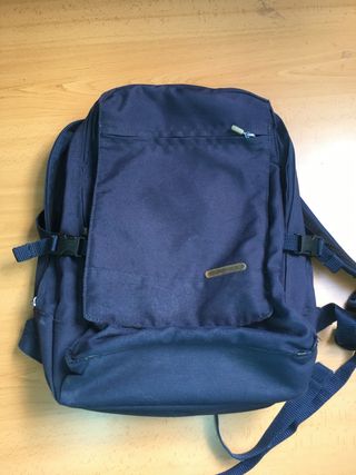 Mochila azul de tela, ideal para llevar tu ordenador portátil y otros objetos. - Compartimento principal espacioso. - Bolsillo frontal con cremallera. - Correas ajustables para los hombros. - Asa superior para colgar. - Pequeño detalle metálico en la parte frontal.