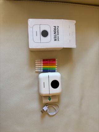 Práctica impresora portátil para llevar contigo a donde necesites. Incluye varios accesorios para su uso. - Impresora mini portátil. - Rollo de papel para imprimir. - Cable de carga USB. - Marcadores de colores.