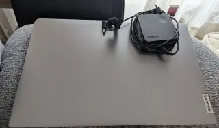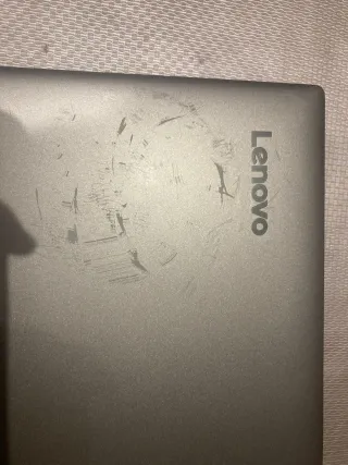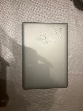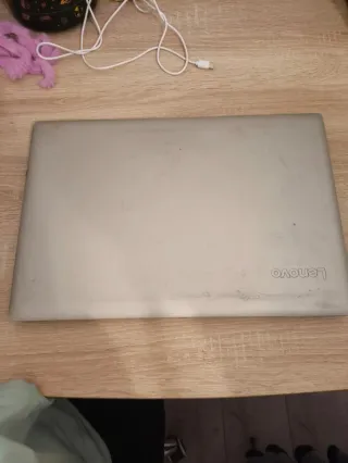 Ordenador portátil de la marca Lenovo en color gris. Presenta algunas marcas de uso en la tapa. - Diseño elegante y moderno. - Acabado metálico.