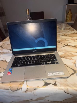 Ordenador portátil Acer en color plata y negro. - Pantalla de 14 pulgadas. - Teclado QWERTY en español. - Incluye pegatinas de Intel y de servicio técnico 2021.