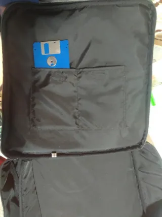 Maletín vintage para portátil que incluye un disquete. - Color negro y azul. - Diseño clásico.