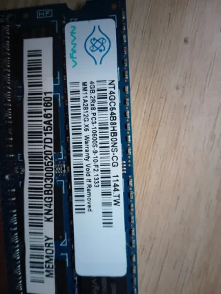 Módulo de memoria RAM para portátil. - Capacidad: 4GB - Tipo: DDR3 SODIMM - Velocidad: PC3-10600S (1333MHz) - Modelo: NT4GC64B8HBONS-CG - Número de parte: MM11A2812G.X6