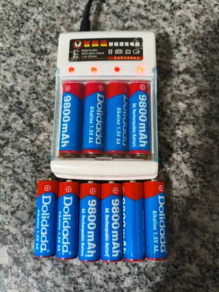 Incluye un cargador de pilas y 10 pilas recargables tipo AA. - Pilas recargables Dolidada. - Capacidad de 9800 mAh. - Voltaje de 1.5V AA.