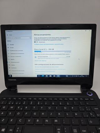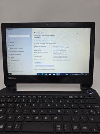 Portátil Toshiba Pro NB10 en color negro. Cuenta con 8GB de RAM y un disco SSD de 128GB. - Sistema operativo Windows 10 Pro. - Procesador Intel Celeron N2840. - Pantalla de 11.6 pulgadas. Con cargador original. Sin batería.