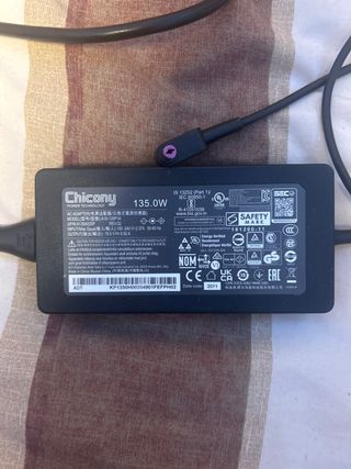 Adaptador de corriente Chicony de 135W. - Potencia de salida: 19.5V 6.52A. - Voltaje de entrada: 100-240V, 50-60 Hz. - Modelo: A18-135P1A.