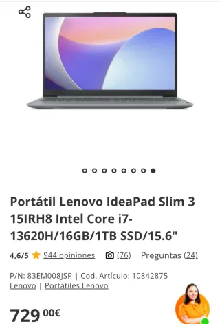 Portátil Lenovo IdeaPad Slim 3 en color gris - Lo compré en Octubre y tiene el seguro de PC COMPONENTES durante un año - Pantalla de 15.6 pulgadas. - Procesador Intel Core i7-13620H. - 16GB de memoria RAM. - Almacenamiento SSD de 1TB. Incluye funda del portátil y seguro Puedo mandar fotos, está en perfecto estado todo Tiene instalado word, excel, Photoshop, Lightroom...