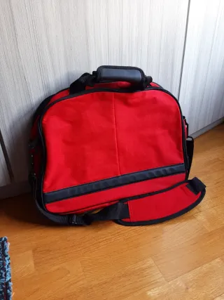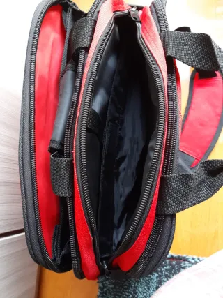 Maletín de color rojo con detalles en negro. Es un accesorio práctico para llevar tus pertenencias. - Medidas: 40 cm ancho, 30 largo, 15 fondo. - Doble compartimento. - Asa superior acolchada. - Correa de hombro ajustable. - Compartimento principal amplio.