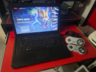 Portátil Compaq con temática de arcade, ideal para los amantes de los videojuegos retro. Incluye dos mandos estilo SNES para una experiencia de juego inmersiva. - Pantalla con interfaz de juegos. - Dos mandos de control incluidos. Dudas por privado.