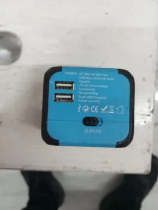 Adaptador de enchufe universal con dos puertos USB. -Adaptador de enchufe para Inglaterra, Estados Unidos y Australia - Potencia: AC Max. 6A 250 Vac - USB: Max. 2400 mA 5Vdc - No apto para conversión AC-AC de alto voltaje - No incluye toma de tierra - Carga dual USB - Uso en interiores únicamente - Diseñado para Europa