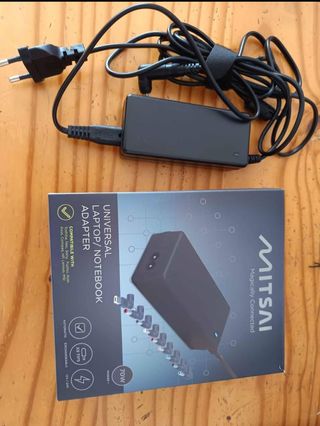 Adaptador universal para portátil MITSAI de 70W. Está en perfecto estado. - Compatible con múltiples marcas de portátiles. - Incluye 9 puntas intercambiables. - Sistema automático de conexión. - 12V / 24V.