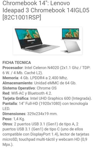 Portátil Lenovo IdeaPad 3 de 15.6” con pantalla Full HD IPS antirreflejos, perfecto para estudiar o teletrabajar. Especificaciones: Procesador Intel Celeron N4020 8GB RAM SSD de 256GB Gráficos Intel UHD 600 conectividad WiFi ac + Bluetooth 5.0 Puertos HDMI, USB 3.1, lector SD. Incluye Windows 11 Home en español. Con solo 1,7kg, es ligero para llevar a cualquier parte. Color elegante Business Black. Tiene 4 años, pero está muy bien conservado y funciona perfectamente. Lo único que tiene la batería un poco degradada pero sigue perfectamente durando varias horas de uso. Sólo venta en mano en Santa Cruz de Tenerife. Negociable.