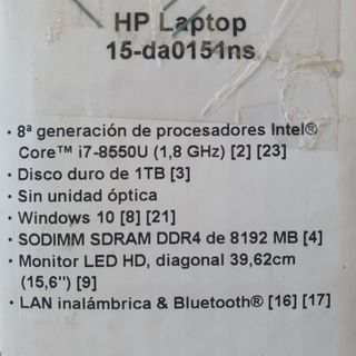 Portátil HP con procesador Intel i7-8550U y 8GB de RAM. - Disco duro de 1TB. - Sistema operativo Windows 10. - Color plateado y marron gris PUERTOS ENTRADA/SALIDA 3 USB A 1 HDMI 1 ETHERNET 1 AURICULAR 3.5MM 1 LECTOR TARJETA SDHC Nuevo, NUNCA se llego a usar Entrega en mano Zona La Salle, El Corte Ingles, Tres de Mayo