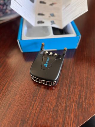 Refrigerador portátil para ordenador. - Diseño compacto y ligero. - Rejilla frontal plateada. - Dos antenas en la parte superior. - Botones de control en la parte superior.