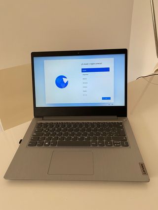 Portátil Lenovo IdeaPad 3 con acabado en gris y plata. - Pantalla de 14 pulgadas. - Diseño ligero y portátil. - Salud de la batería 58,5% - Incluye cargador original y mouse