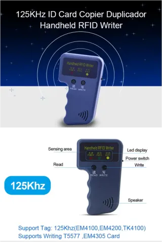 Duplicador y escritor RFID portátil para tarjetas de 125KHz. - Soporta lectura y escritura de tarjetas. - Compatible con T5577 y EM4305. - Pantalla LED para visualización. - Botones de lectura y escritura. - Altavoz integrado. Sirve para copiar llaves digitales de portales, garajes...
