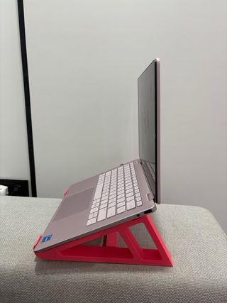 Soporte para portátil en color rosa, diseñado para elevar tu equipo. - Diseño triangular. - Material de plástico resistente.