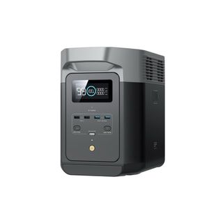 Estación de energía portátil Ecoflow Delta 2 en color negro y gris. - Pantalla digital con información de carga. - Múltiples puertos USB-A y USB-C. - Indicador de Fast Charge.