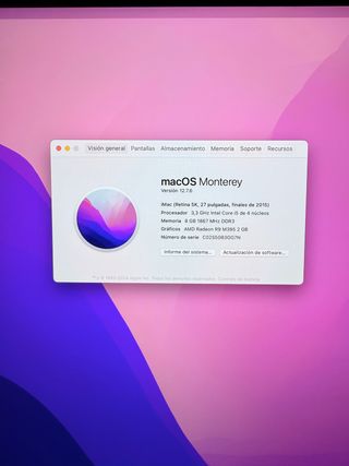 Este iMac Apple de 27 pulgadas está en perfecto estado. con teclado y mouse Apple inalámbricos. pantalla Retina 5K es un modelo de finales de 2015. Cuenta con un procesador Intel Core i5 y gráficos AMD Radeon R9 M395. - Pantalla: Retina 5K, 27 pulgadas - Procesador: 3,3 GHz Intel Core i5 (4 núcleos) - Memoria RAM: 8 GB DDR3 1867 MHz - Gráficos: AMD Radeon R9 M395 2 GB