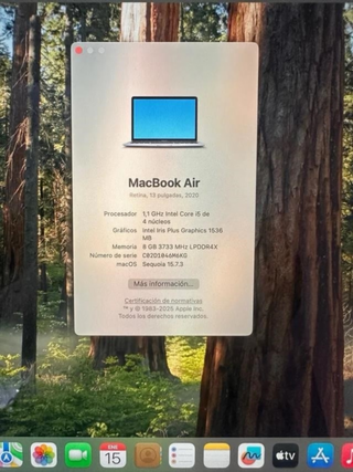 MacBook Air de 13 pulgadas, modelo 2020, con acabado en gris espacial. Equipado con procesador Intel Core i5 y 8 GB de memoria RAM. - Pantalla Retina de 13 pulgadas. - Procesador: 1,1 GHz Intel Core i5 de 4 núcleos. - Gráficos: Intel Iris Plus Graphics 1536 MB. - Memoria: 8 GB 3733 MHz LPDDR4X. - Número de serie: C02D1046M6KO. - macOS Sequoia 15.7.3.