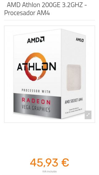 Procesador AMD Athlon 200GE para socket AM4, ideal para equipos domésticos y de oficina. Integra gráficos Radeon Vega 3, permitiendo usar el PC sin tarjeta gráfica dedicada. Cuenta con 2 núcleos y 4 hilos, frecuencia base de 3,2 GHz, caché total de 4 MB y proceso de fabricación de 14nm. Soporta memoria DDR4 hasta 2667MHz y tiene un TDP eficiente de solo 35W, ofreciendo bajo consumo y funcionamiento silencioso. Compatible con placas base AM4 con chipsets A320, B350, X370, B450 y X470 (puede requerir actualización de BIOS según modelo). No compatible con chipsets B550, X570 ni A520. Perfecto para tareas diarias, multimedia, navegac...