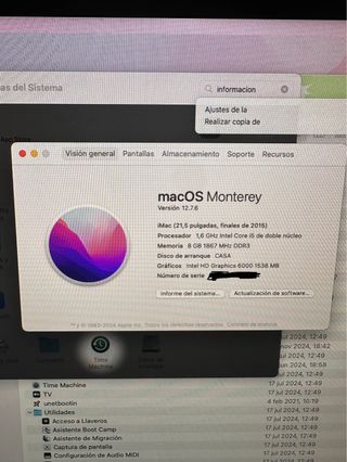 iMac 21'5 totalmente actualizado y funcional en 2026. Sistema Operativo SONOMA 2023 Procesador i5 Ram 8g ampliables Disco SSD 256g Pantalla Full HD 1080p 21'5" Bluetooth Mi Teclado y ratón inalámbricos originales APPLE El pc se encuentra en un estado excelente, muy rápido y fluido, sonido envolvente y nitido Actualizado a nivel software para soportar el sistema operativo SONOMA totalmente funcional con todas las apps de Apple store, actualiza todas las app. No hace falta gastarse miles de euros para seguir disfrutando de la experiencia Apple 2026. +Info... #oficina #empresa #local #apple #macbook #ordenador #mac #sequoia