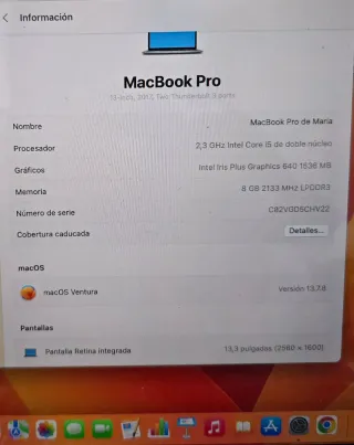 MacBook Pro de 13 pulgadas del año 2017. - Procesador: 2,3 GHz Intel Core i5 de doble núcleo - RAM:8 GB 2133 MHz LPDDR3 - Pantalla Retina. - Graficos: Intel Iris Plus Graphics 640 1536 MB