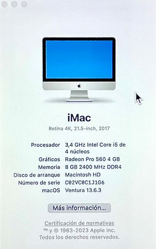 Retina 5K, 27-inch, 2017 Procesador 3,4 GHz Intel Core i5 de 4 núcleos Gráficos Radeon Pro 570 4 GB Memoria 8 GB 2400 MHz DDR4 Disco de arranque Macintosh HD - Data macOS Ventura 13.7.8 con ratón Magic y teclado Apple