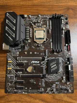 No viene en la caja original. Incluyo medio tubo de pasta térmica Artic MX-4 (unos 3-4 gramos). Placa base MSI Z390-A PRO en buen estado, junto con un procesador Intel Core i5-9600K. MSI Z390-A PRO: Socket de procesador: LGA 1151 (Socket H4) Procesador compatible: Intel® Celeron®, Intel® Core™ i3, Intel Core i5, Intel Core i7, Intel Pentium Tipos de memoria compatibles: DDR4-SDRAM Tipos de unidades de almacenamiento admitidas: HDD & SSD Intel i5 9600k: Frecuencia 3,7 GHz