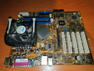 Placa base ASUS para socket 478. Se incluye procesador Intel instalado (no sé cuál es) con su disipador y ventilador original. Funciona perfectamente. Soporte memoria DDR Ranura AGP Varios PCI Conectores IDE Formato ATX Perfecta para PC antiguo, retro gaming, reparaciones o coleccionistas.
