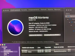 Este iMac de 27 pulgadas, lanzado a finales de 2009, cuenta con un procesador Intel Core i5 de 4 núcleos. - Procesador: 2,66 GHz Intel Core i5 (4 núcleos) - Memoria RAM: 4 GB DDR3 a 1333 MHz - Gráficos: ATI Radeon HD 4850 con 512 MB Se vende sin ratón y sin teclado pero con su cable original. Recién formateado con Monterrey y está listo para disfrutarlo. No hago envío, se puede venir a probar sin problema por las tardes o finde.