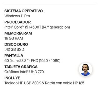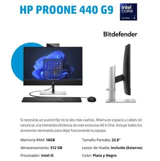 Este equipo HP ProOne 440 G9 es una solución compacta y eficiente para tu espacio de trabajo. Ahorra en cables y disfruta de un diseño todo en uno. - Memoria RAM: 16GB - Almacenamiento: 512 GB - Procesador: Intel i5 - Tamaño Pantalla: 23,8 - Lector de Huella: Incluido (Externo) - Color: Plata y Negro