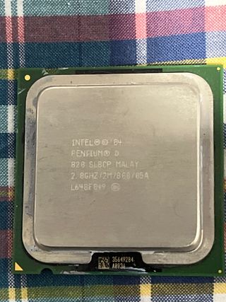 Procesador Intel 4 Pentium D con una velocidad de 2.8 GHz y caché de 2 MB. 2 núcleos y 2 hilos de procesamiento. Para socket LGA775 - Modelo: SL8CP - Fabricado en Malasia - Número de serie: L648F049