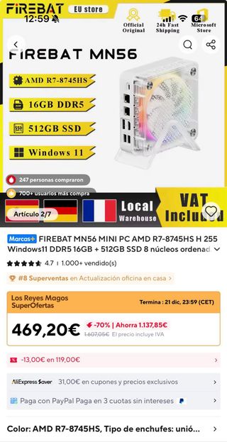 Mini ordenador con procesador Ryzen 7. Diseño compacto y moderno. - Procesador: Ryzen 7 8745S - RAM: 16gb DDR5 - GPU: AMD 780M - SSD 512GB - Windows 11 instalado - Color: Blanco Sin uso, solo arrancado para validar que funciona.