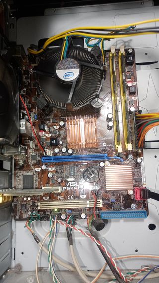 Placa base Asus P5G41T-M LX con procesador Intel E5700 de 3.0GHz y 4GB RAM DDR3. ChipSet Intel G41, Soporta: Core 2 Quad, Core 2 Duo, 1333/1066/800MHz, Memoria: DDR3 1333(O.C.), 1066MHz, 2 Bancos, 8GBMax, y DDR2. Integrado: Audio HD, Red, Video Intel, Diseño: mATX, Puertos: 1xPCIEx16, 1xPCIEx1, 2xPCI 20€ todo. Si quieres la caja donde va montada +10€. No lleva disco duro y la fuente habría que cambiarla, chilla. LLeva un DVD y un lector de Tarjetas no comprobado. - Procesador Intel E5700 3.0GHz. - 4GB de memoria RAM DDR3. - Placa base Asus P5G41T-M LX.