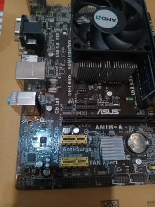 Placa base ASUS AM1M-A con procesador AMD Athlon 5350 y 8GB de RAM DDR3. - Placa base AM1M-A micro ATX - Procesador AMD Athlon 5350. - 8GB de memoria RAM DDR3. - Funciona perfectamente - Ideal para HTPC o cualquier otro proyecto que requiera un sistema de muy bajo consumo, tdp solo 25 W. - Con Disipador de CPU personalizado, muy silencioso. - Se entrega chapa trasera y disipador original.