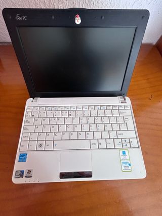 Portátil Asus Eee PC en color blanco. Ideal para tareas básicas. Está formateado sin ningún dato y su sistema operativo Windows. Pantalla de 10 pulgadas. Procesador Intel Atom. Se da con el maletín para guardarlo.