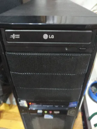 Ordenador de sobremesa LG en color negro. Cuenta con unidad óptica. - Unidad óptica Super Multi. - Puertos frontales de audio y USB. - procesador premium G645 - gráfica Nvidia n9400gt - disco duro ssd 250gb - 4gb de ram - fuente de alimentación 580w - mucho almacenamiento para discos duros. -windows 11