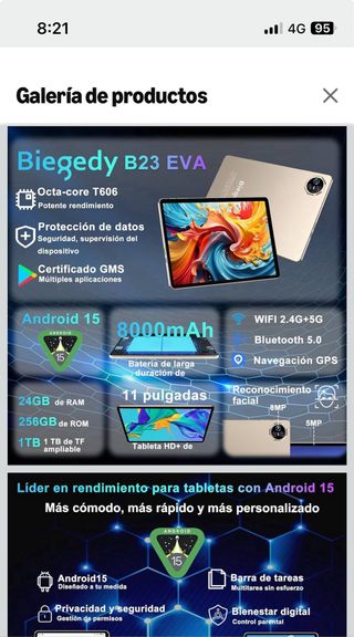 •NUEVA A ESTRENAR• pvp oficial amazon: 199,99€ Tablet biegedy B23 en color negro. - Pantalla de 11 pulgadas. - Sistema operativo Android 15. - Procesador Gemini AI Octa-Core a 2.0GHz. - 24GB de RAM y 256GB de ROM. - Batería de 8000 mAh. - Conectividad 5G WiFi. - Cámara frontal de 5MP y trasera de 13MP. - Incluye cargador y protector de pantalla.