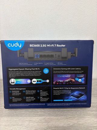 Router Cudy BE3600 con tecnología Wi-Fi 7 de doble banda. Ofrece un procesador Quad-Core de 2 GHz y un puerto WAN de 2.5 Gbps para una conexión ultrarrápida. - Velocidad máxima de 3568 Mbps. - Procesador Quad-Core de 2 GHz. - Puerto WAN de 2.5 Gbps.