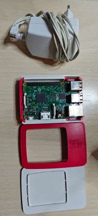 Placa Raspberry Pi 3B con su carcasa roja y blanca. - Placa Raspberry Pi 3B. - Carcasa de dos piezas (roja y blanca). - Cargador original - Tarjeta SD nueva recomendaba por el fabricante