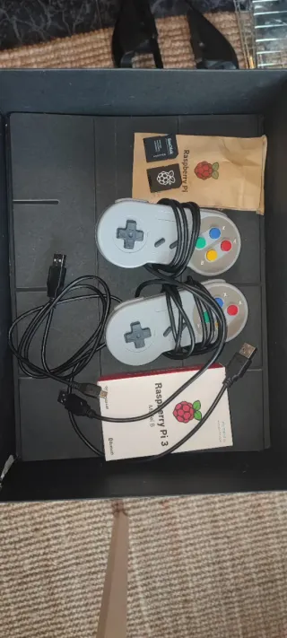 Se vende Raspberry Pi 3 Model B junto con accesorios. - Incluye caja original. - Tarjeta SD SanDisk. - Adaptador para tarjeta SD. - 2 mandos super Nintendo usb