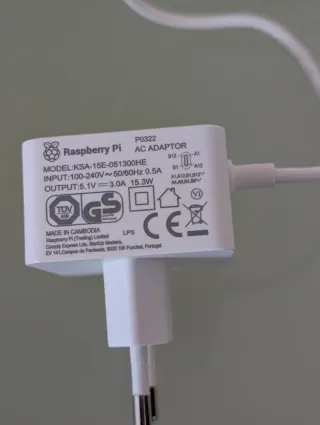 Adaptador de corriente para Raspberry Pi. - Modelo: KSA-15E-051300HE - Entrada: 100-240V~50/60Hz 0.5A - Salida: 5.1V === 3.0A 15.3W - Fabricado en Camboya - Certificaciones TUV, GS, LPS, CE, VI