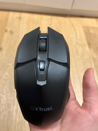 Ratón gaming de la marca GX Trust en color negro. Wireless conectado con USB. Botón de cambio de DPI. Luces RBG en los lados y logo. No incluye cargador pero es uno normal USB-C
