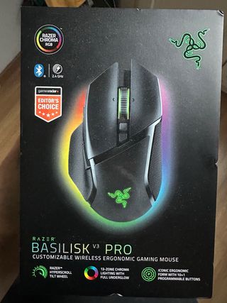 Ratón gaming inalámbrico Razer Basilisk V3 Pro. - Conexión Bluetooth y 2.4 GHz. - Rueda de scroll Hyperscroll con inclinación. - Iluminación Chroma RGB de 13 zonas con underglow. - Diseño ergonómico con 10+1 botones programables.