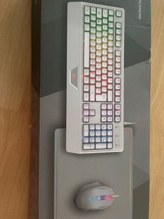 Pack de teclado gaming con retroiluminación RGB y ratón inalámbrico. - Teclado Mars Gaming con múltiples efectos de luz. - Ratón Logitech con receptor USB (inalámbrico). Ambos en perfectas condiciones.