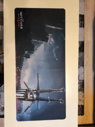 Alfombrilla gaming XXL inspirada en The Witcher. Tamaño grande 90×40 cm, ideal para escritorio completo. Superficie lisa para un deslizamiento óptimo del ratón. Diseño de espadas y castillo, colores intensos. Nueva, sin usar.