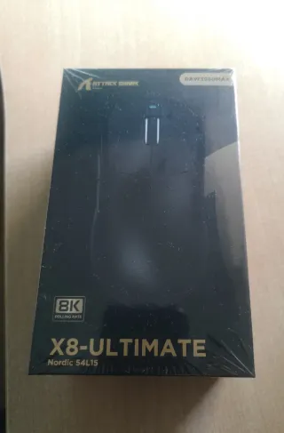 Ratón Attack Shark X8 Ultimate en color negro. -Conexiónes 2.4 GHz, Bluetooth, cableado - Sensor PAW3950MAX. - Tasa de sondeo polling rate 8000 Hz - Chipset Nordic 54L15. - 42000 DPI -Batería 800 mAh que pueda durar hasta unas 70 horas de uso continuado con el modo 2.4 GHz