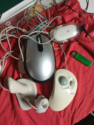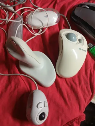 Conjunto de ratones de ordenador con diseños variados. - Ratón Microsoft con trackball. - Ratón Apple blanco con cubierta transparente. - Ratón ergonómico blanco. - Ratón con bola negra en la parte inferior.