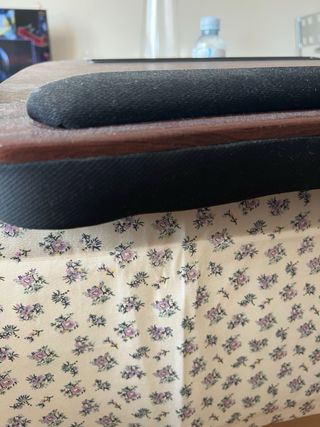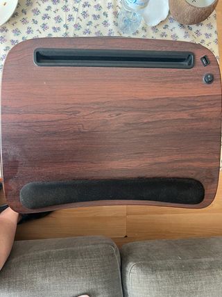 Mesa portátil para usar el ordenador en el sofá. No tiene uso y es muy cómoda. - Superficie de madera. - Reposamuñecas acolchado. - Ranura para el portátil. - Puerto USB. - Con soporte para raton